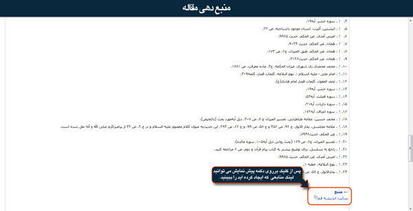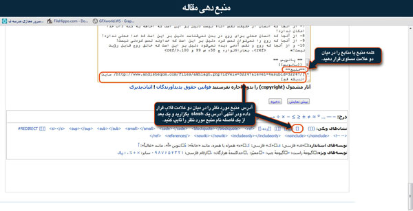 2. در خط بعدی از نشانه های پایین صفحه[] را انتخاب کرده و آدرس سایتی را که مقاله را از آن گرفته ایم کپی و در قلاب پیست می کنیم.