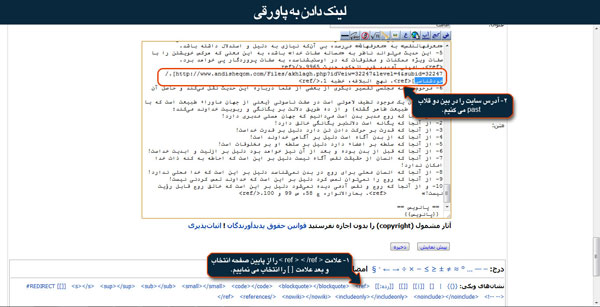 - علامت< ref > < /ref > را از پایین صفحه انتخاب و بعد علامت [ ] را انتخاب نموده.